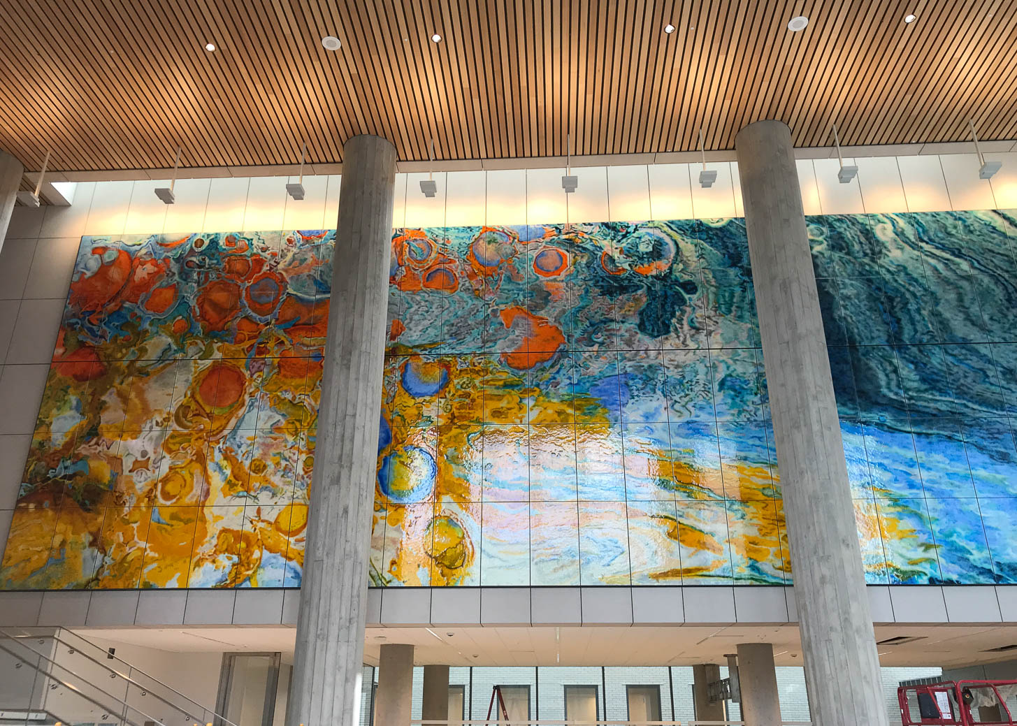 Artist Lynn Basa’s 25’ x 71’ artwork had its inaugural year presiding over the lobby of the new 17-story Multnomah County Central Courthouse in Portland, OR. Composed of 120 5′ tall x 3′ wide panels made entirely of kilnformed glass, the 1,775-square-foot artwork represents Bullseye Studio’s ability to deliver fabrications that faithfully translate artworks from different mediums to kilnformed glass at large scale—and at budget. For more project details…